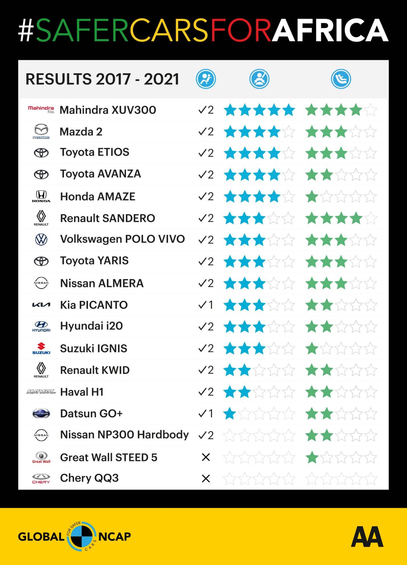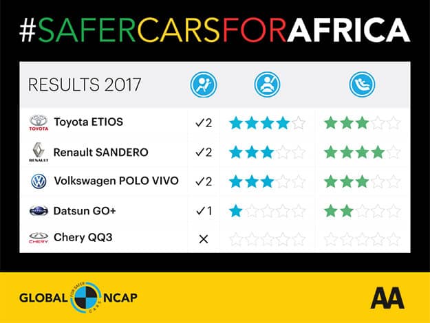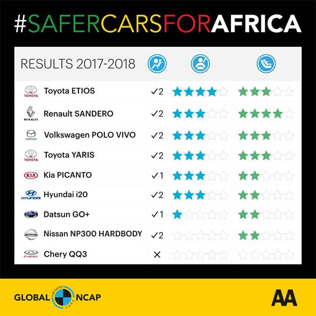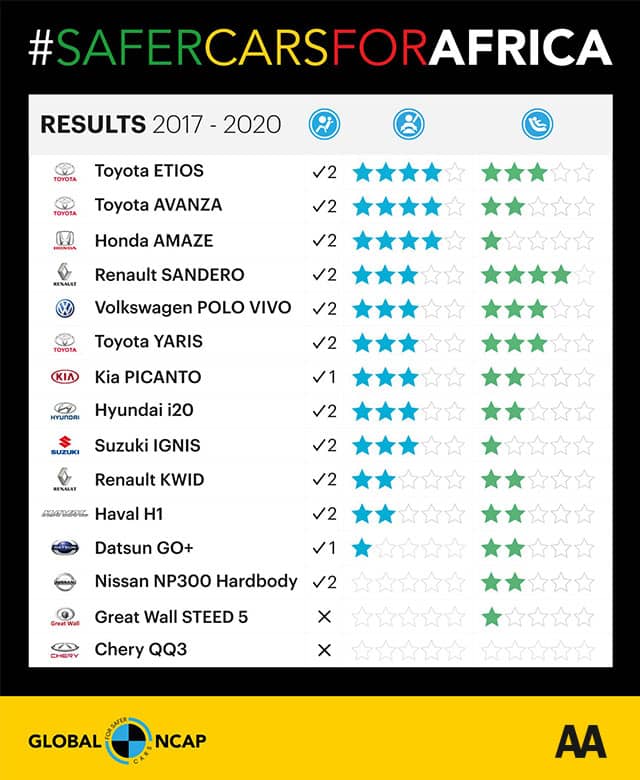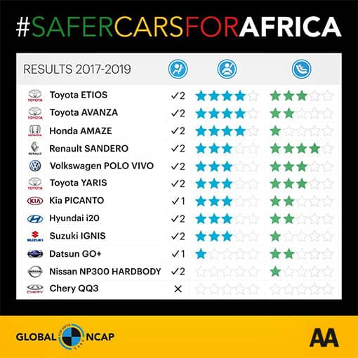 The #SaferCarsForAfrica Campaign was launched by Global NCAP in 2017 with the objective of promoting safer vehicles across the continent of Africa. In collaboration with the AA, Global NCAP crash tests vehicles available locally in South Africa and rates them according to the safety they provide the occupants of the vehicle. The #SaferCarsForAfrica programme is supported by the FIA Foundation and Bloomberg Philanthropies.