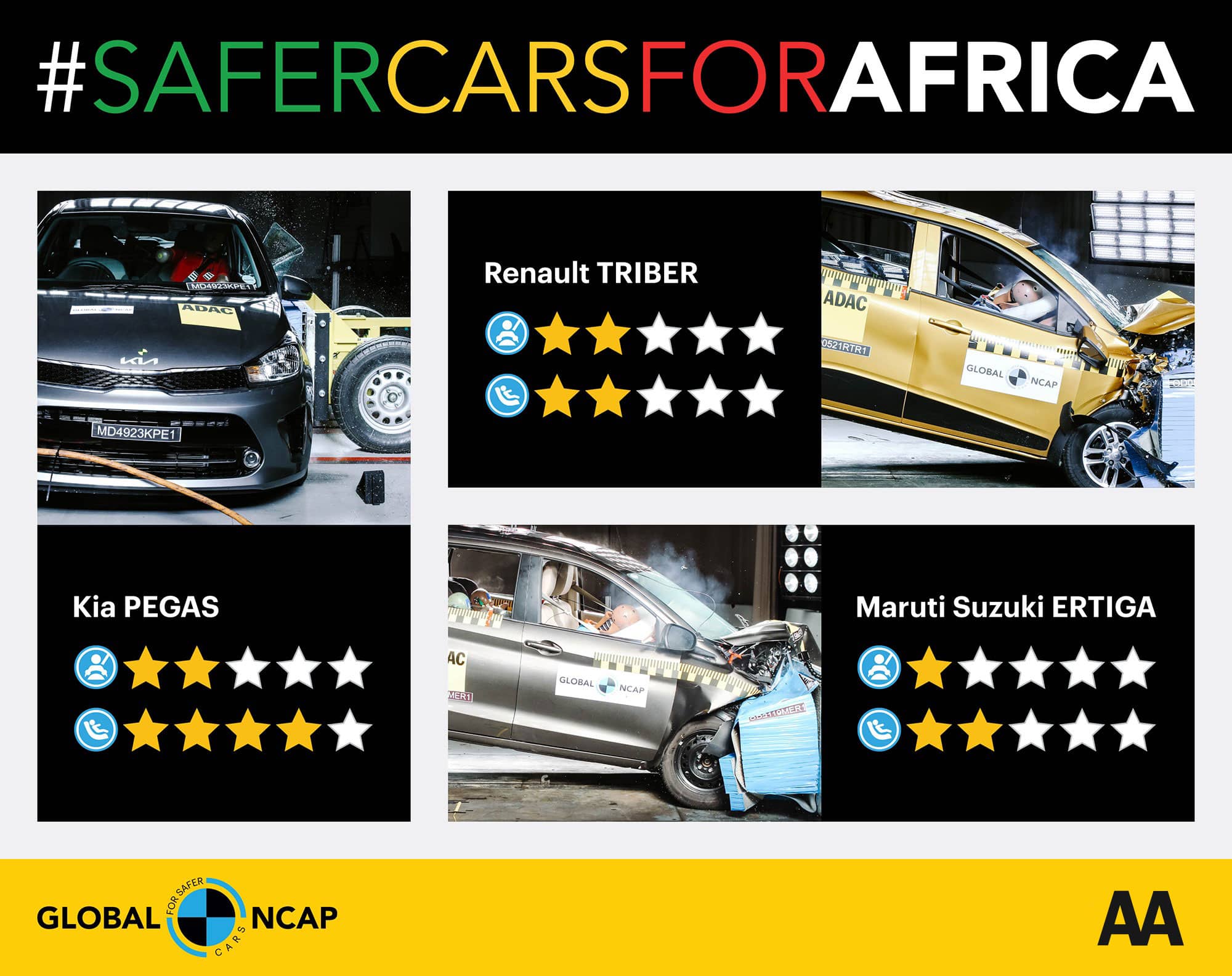 Global NCAP’s new #SaferCarsForAfrica crash results reveal a disappointing two-star occupant safety rating for the Kia Pegas and Renault Triber and only one star for the Maruti Suzuki Ertiga.